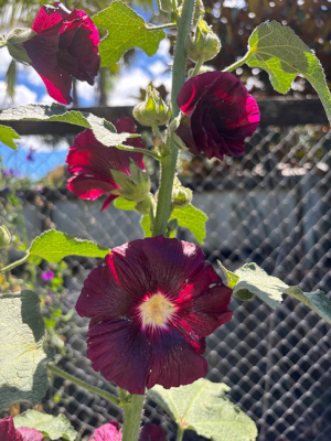 This hollyhock has the deepest dark maroon red flowers which appear almost black in colour. Alcea ‘Jet Black’ is an old- fashioned plant , dating back to the 17 century. It has been very popular with gardeners through the years. This alcea performs well in most situations, and its tall nearly black single flowers are produced each year, benefiting the garden design with its structural properties. The plant dies down in winter, to a small rosette in warm temperatures and in cold ones will lose its leaves entirely. It will re-emerge in spring , and the flowers will take your breath away, they are so beautiful. Plant them along paths to provide a nice outline and fences to show off their beauty .