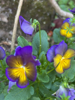 This pansy produces flowers with a deep brown face which have golden centres and warm brown rays spreading out from the centres. The top petals are a soft deep violet blue which seems to glow against the deep brown faces. The flowers are mid sized with stout stems and the plant is compact and well branched. The plant can withstand winter temperatures well, and the flowers are good for cutting. In northern areas it will produce flowers through the winter for you.